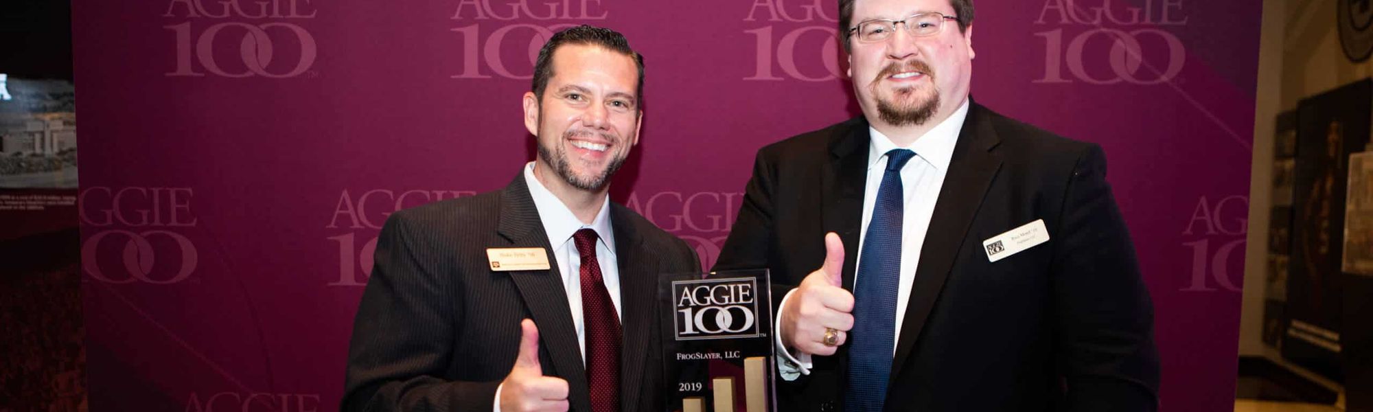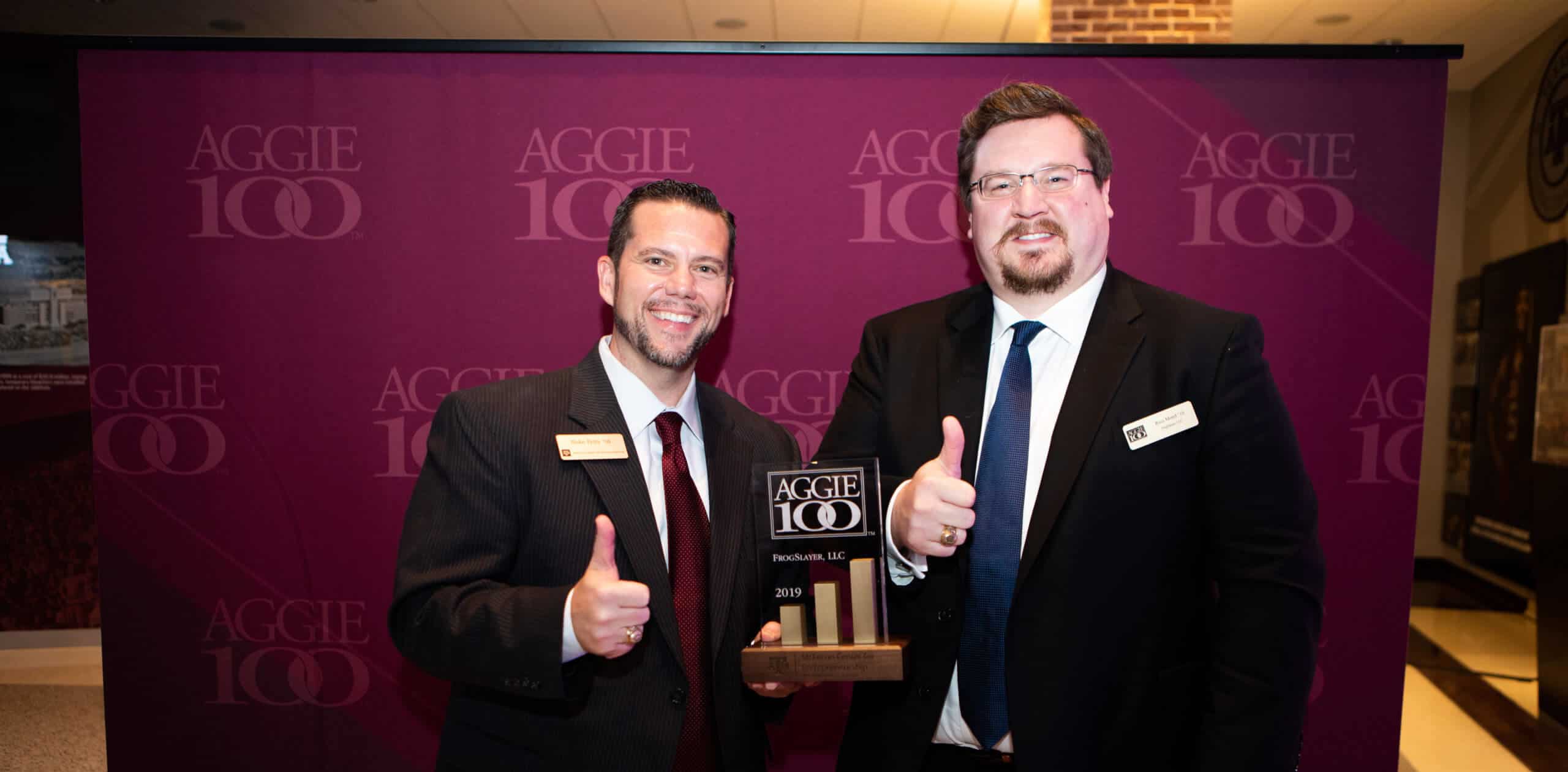 (College Station, TX – October 25, 2019) Custom software and business innovation consulting firm, Frogslayer, was recognized for the 5th time at the 15th annual Aggie 100 awards ceremony. Aggies from all over the world gathered at the Ford Hall of Champions in Kyle Field on October 25th for this year’s event.